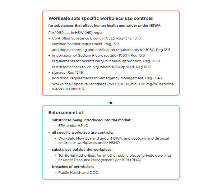 We enforce the rules relating to the use, handling and storage of hazardous substances, including 1080 and importation of pure form of 1080, in workplace settings. Regulations on hazardous substances under the Health and Safety at Work Act 2015 (HSWA) set out rules that must be followed by organisations using 1080 pellets, including: