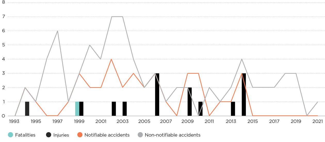 - Three notifiable accidents resulting one fatality and injuring two people. There were no fatal accidents during 2016 and 2019 (four years). Over the past 29 years there has been an average of 1.7 fatalities per year.